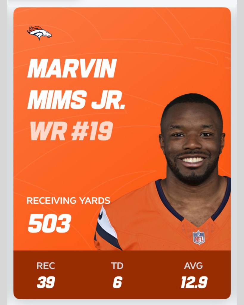 Marvin Mims Jr. proved to be one of the team’s most explosive weapons, finishing with 503 yards and six touchdowns on just 39 catches. His speed forced defenses to adjust, and Sean Payton noted his improvement in mental processing: