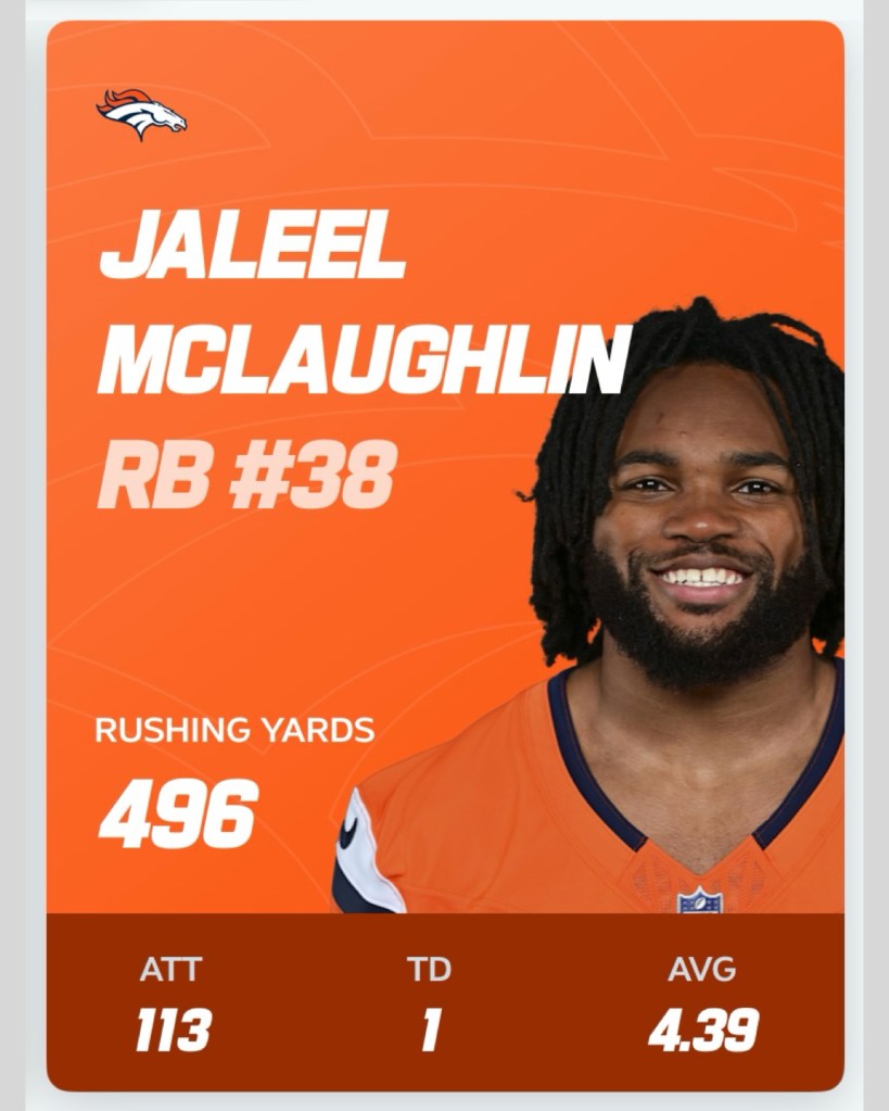 In the backfield, Jaleel McLaughlin emerged as a dynamic option with 496 rushing yards on just 113 carries. His 4.39 yards per carry highlighted his burst and ability to turn small openings into big gains.